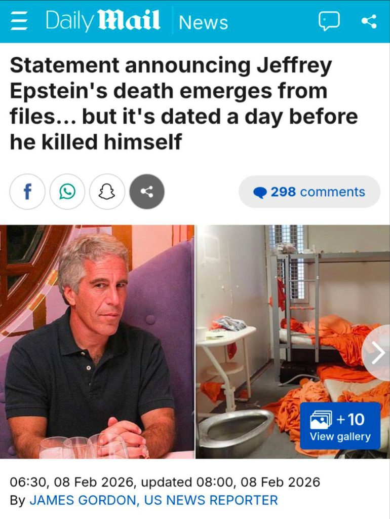 Кстати, в документах также обнаружилось заявление о смерти Джеффри Эпштейна, датированное… за день до того, как его нашли мёртвым в камере.