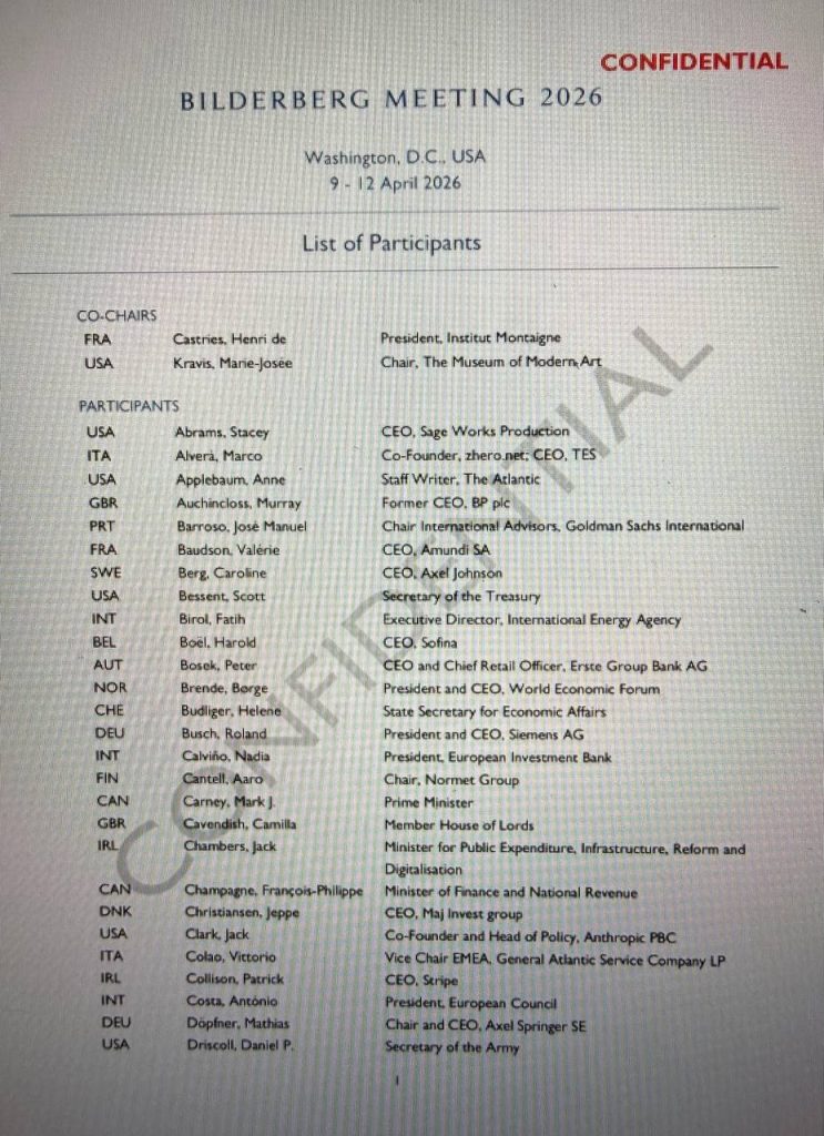 Обнародован полный список участников Бильдербергской встречи, которая пройдёт 9–12 апреля в Вашингтоне.