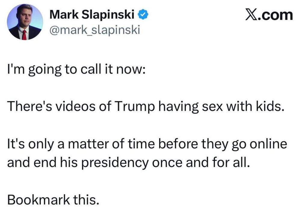 Телеграм-каналы массово публикуют заявление канадского блогера Марка Слапински о существовании видео, на которых Трамп занимается сексом с детьми.
