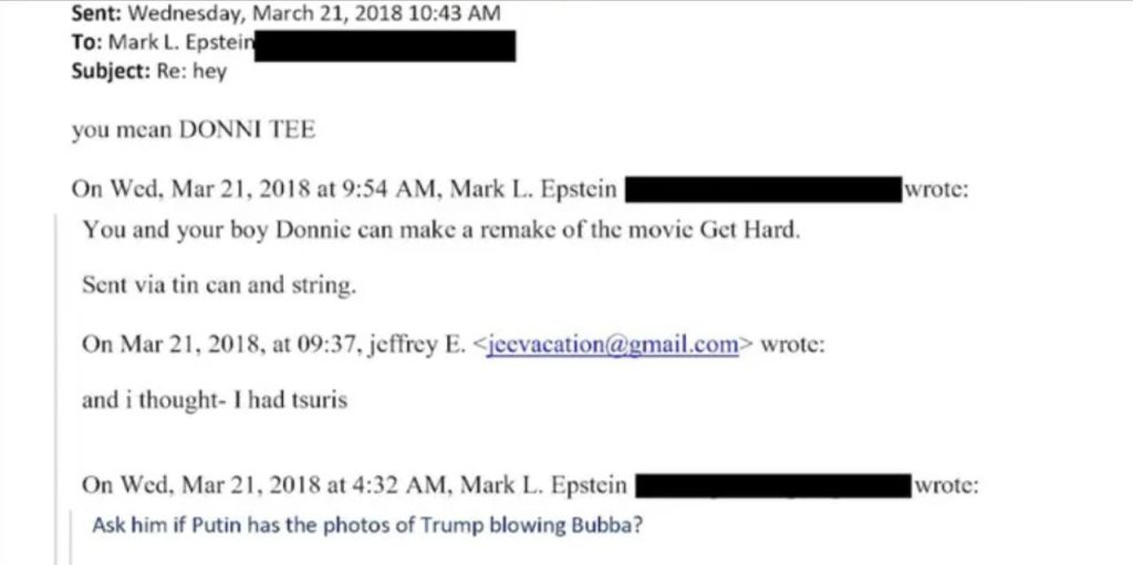 Согласно скриншоту, Марк Эпштейн однажды отправил своему брату Джеффри электронное письмо, в котором предложил спросить бывшего главного стратега Белого дома Стивена Бэннона, «есть ли у Путина фотографии, на которых Трамп сосет Буббе (прозвище Клинтона, который также был близко знаком с Эпштейном — Ред.)».